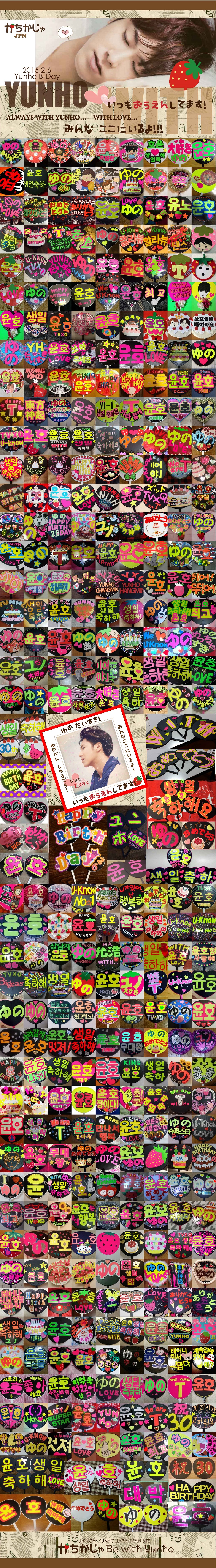 2015.2.6 WITHコン初日 でもあり YUNHOの30歳(日本では29歳)のお誕生日! YUNHOにとって「特別」な日」… YUNHOをお祝いするために沢山のユノペンが集合しました! ユノへの溢れる想いを伝えるために… ユノ応援うちわを集めてひとつのコラージュ画像で表現しました ユノお誕生日おめでとう 私たちはここにいます!わたしたちはずっと変わらず応援します! ユノが大好きです!!! 皆さんから寄せられた手作りウチワの一つ一つ どれも素敵で愛情が溢れています… 「ユノ」というワードと 「ユノへの溢れる想い」は同じなのに どれひとつとして同じでない ぜんぶ違う… 「ユノへお誕生日メッセ」もそう… アイデアと工夫が詰まったそれらは みていても 時を忘れるほど楽しく そしてユノへの想いが溢れていて感動的です ユノもきっと喜んでくれると思います♡