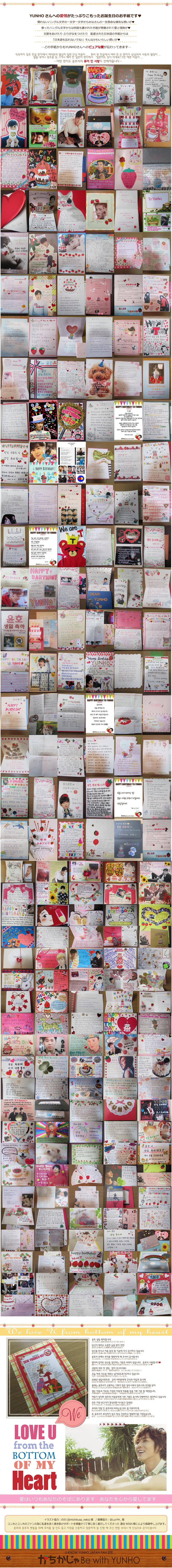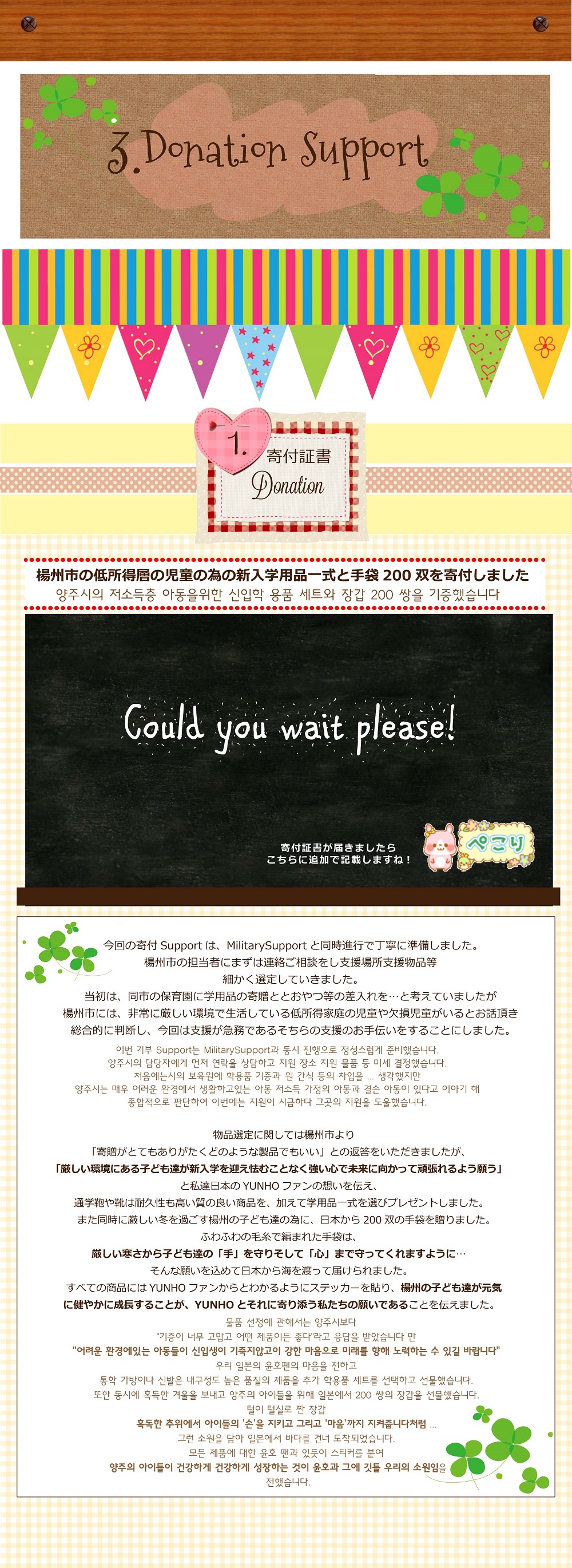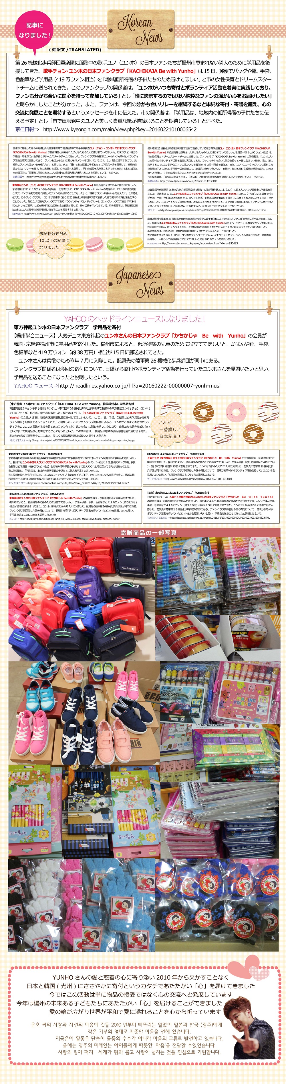 2016.2.27追記ここから ↓↓↓ 3.Donation SUPPORT 楊州市「寄付証書」が未着ですが ご参加くださった皆様をお待たせするのは心苦しいので、その部分は追記するとして先ずご報告させて頂くことにしました。 ![]() ![]() ![]() ![]() ![]() ![]() ![]() ![]() ![]() ![]() かちかじゃの寄付の記事リンクです ★韓国語記事★ 京仁日報⇒ユノユンホ日本ファンクラブの会員の子供の学用品の寄付 第26機械化歩兵師団軍楽隊に服務中の歌手ユノ(ユンホ)の日本ファンたちが 揚州市恵まれない隣人のために学用品を後援してきた。 歌手チョン・ユンホの日本ファンクラブ「KACHIKAJA Be with Yunho」は 15日、郵便でバッグや靴、手袋、色鉛筆など学用品(419万ウォン相当)を 「地域低所得層の子供たちのため届けてほしい」と市の女性保育とドリームスタートチームに送られてきた。 このファンクラブの関係者は、 「ユンホがいつも寄付とボランティア活動を着実に実践しておりファンも分かち合いに関心を持って参加している」とし 「誰に誇示するのではない純粋なファンの温かい心をお届けしたい」と明らかにしたことが分かった。 また、ファンは、今回の分かち合いリレーを継続するなど単純な寄付・寄贈を超え、 心の交流に発展ことを期待するというメッセージを市に伝えた。 市の関係者は、「学用品は、地域内の低所得層の子供たちに伝える予定」とし 「市で軍服務中のユノと美しく貴重な縁が持続なることを期待している」と述べた。 京畿日報⇒ユノユンホ日本ファンクラブの会員の子供の学用品の寄付 Newsis⇒ユノユンホ日ファンクラブ、揚州市に学用品寄託 非常経済⇒ユノユンホ日本ファンクラブ揚州市に学用品一体後援 yonhapnews⇒ユノユンホ日ファンクラブ、揚州市に学用品寄託 obsnews⇒ユノユンホ日ファンクラブ、揚州市に学用品寄託< ★日本語記事★ ⇒YAHOOヘッドラインニュースになりました! 韓流STARS⇒[東方神起ユンホの日本ファンクラブ「KACHIKAJA Be with Yunho」、韓国楊州市に学用品寄付 エンタメコリア⇒東方神起ユンホの日本ファンクラブ 学用品を寄付 yonhapnews⇒[芸能]東方神起ユンホの日本ファンクラブ 学用品を寄付 Kstyle⇒東方神起 ユンホの日本ファンクラブ、学用品を寄付 ★韓国楊州市FB担当の方からユンゲル様へのメッセージ★ かちかじゃの学用品寄付についても触れてくださってます http://gall.dcinside.com/board/view/?id=uknow&no=223373&page=1 …一部抜粋和訳… 先日のユンホの誕生日もそうですし〜 今回の日本のファンの方々の学用品寄付もそうですし〜 私たち楊州はユノユンホのおかげでこのようなあたたかい心を受けていますが それだけの恩返しをして差し上げていないようで胸が痛いです。 イラスト・画像協力してくださったのの様、LuvYH_様 サポートのお手伝いをしてくれた日本のユノペンオン二のみなさん 韓国で全面的にご協力くださった連合WISH様 そして準備を手伝ってくださった韓国ユノペンの皆様 そして かちかじゃのサポートにご理解ご協力くださった参加者の皆様 とても素敵な心あたたまるお誕生日の御祝をすることができました。 本当に本当に心からありがとうございました。 |