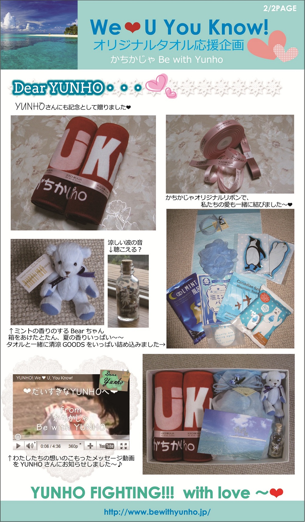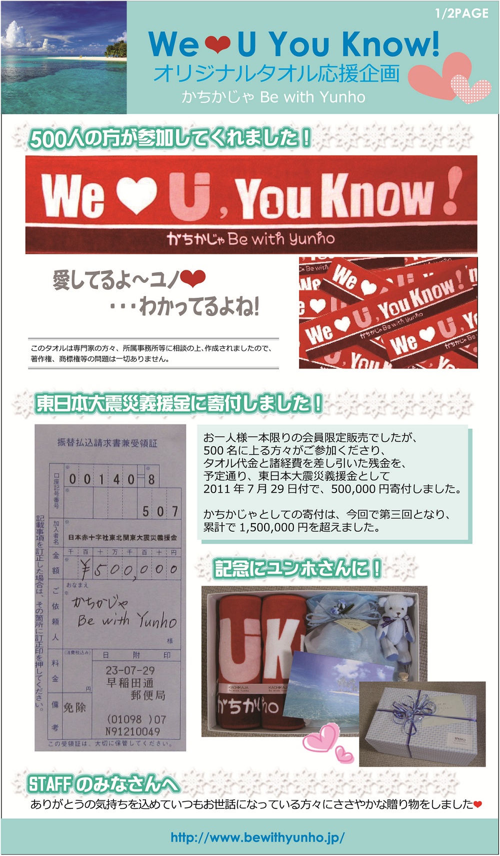 ![]() ![]() We ❤U, You Know! ~愛してるよ~ユノ❤ わかってるよね!~ この企画を通じて、みなさんと同じ想い、同じタオルで ユンホさんを応援できることをとても嬉しく思っています。 また予想をはるかに超え、 多くの方がご参加くださったことにより、 結果として、被災地の方々へ 予想以上の義援金を寄付することができました。 ありがとうございました。 心より感謝いたします。 かちかじゃ管理人 ユンホさんへ贈ったメッセージ動画 ~ユンホさんへのメッセージ動画~ ~日本語字幕部分~ 私たちの大好きな 最高! ナンバー1なYUNHO~ 大好きなYUNHOへ・・・ ******************************************************* かちかじゃメンバーの選んだ、最高YUNHO画像で作りました~ ******************************************************* ♪♪♪♪♪ ♪♪♪♪♪ こんなに深い気持ち、心にあるなんてね。 気付く事が出来なかった、君に出逢うまでは。 ユノ~~ なぜかわからない、惹かれていくよ。 恋の魔法に罹っている、 初めてだよ、どうしようもない❤ ONLY LOVE❤ 君に伝えたい。いつも傍にいさせて! YES? 君が大好きだよ、ずっと❤ もしも君が夢とか、何かに躓いたり、 挫けそうになった時は、私が守るから^___^ 君のおかげなんだよ。 愛する喜びと、優しい心に、たどり着いたよ^^ MY LOVE❤ 生まれ変わってもね。 絶対だよ、君の笑顔、逢いにいくから❤ さあ、二人で歩きだそう! 重なり始めた恋 YES? ギュッと抱きしめて❤ ねえ。 MY LOVE❤ 涙が溢れたよ・・・ 愛しすぎて、優しすぎて、温かすぎて・・・ 世界でひとりの君と、一緒に歩いてく道。YES! ねぇ~ユノ~~~❤ わたし、全然迷ってなんかいないよ^___^v いつでもどんな時でも あなたのことは信じられるから! 真っ直ぐなあなたに、しっかりついていくからね! だから、未来の花嫁は…ユノ子でヨロシク(爆) 大好き❤ ユノがいつもしあわせでありますように・・・❤ ♪♪♪♪♪ ♪♪♪♪♪ かちかじゃ Be with YUNHO |