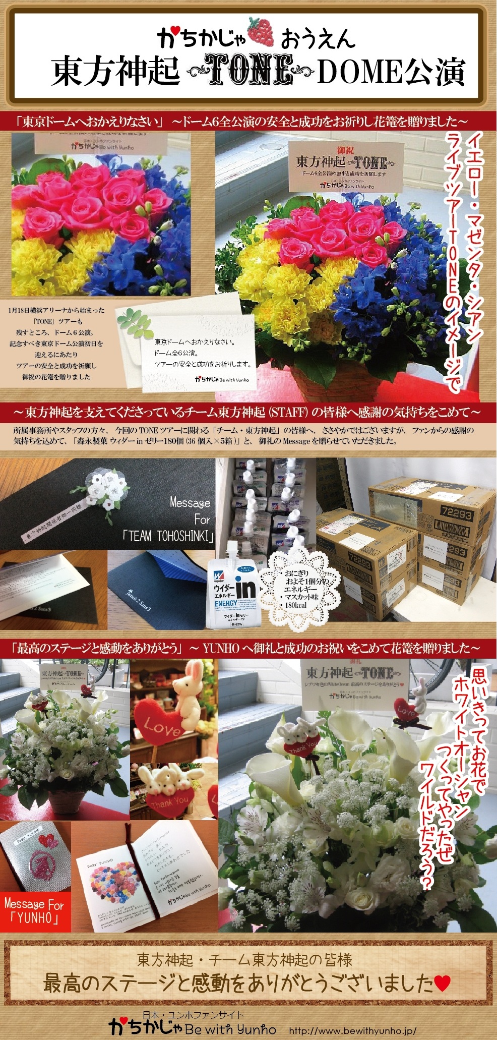 ![]() 「TONE」DOME公演を迎えるにあたり、 1/18横浜アリーナ公演初日の御祝の花篭⇒http://www.bewithyunho.jp/support/support_tone120118.html 3/20アリーナツアー千秋楽の御礼の花篭⇒http://www.bewithyunho.jp/support/tone_120320.html に続き、 東京ドーム初日の前日13日、 ドーム全6公演の安全と成功を祈願し、御祝の花篭を贈りました。 ライブツアー「TONE」をイメージして、 カラフルな、MAGENTA YELLOW CYAN のイメージで。 春らしいカラフルな花篭になりました。 また 所属事務所様やSTAFFの方々など、 この「TONEツアー」に関わる「Team TOHOSHINKI」の皆様へ ささやかではございますが、ファンの感謝の気持ちを込めて、 ウィダーinゼリー180個(36個入×5箱)と、御礼のMessageをお贈りしました。 私たちファンの感謝の気持ちが少しでもつたわればいいですね。 そして・・・ 大盛況の中、迎えたツアー千秋楽。 最高のステージと感動を私たちにプレゼントしてくれた東方神起YUNHOさんへ 御礼のMessageと、花篭を贈りました。 「シアワセ色の White Ocean! 最高のステージをありがとう」 YUNHOさんの美しい涙を 私たちは一生忘れません。 思い切って お花で WhiteOcean つくってやったぜ! ワイルドだろう(* ̄▽ ̄) by スギちゃんのまねしたかちかじゃ管理人 かちかじゃ管理人 |